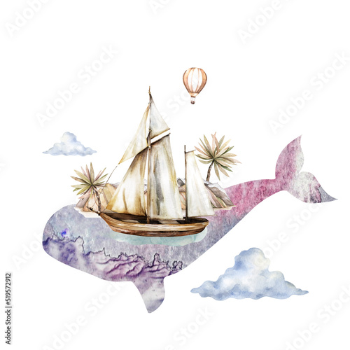 Whale in the clouds with the moon, Ship on tropical island watercolor illustration on a white background. Palm trees and seagulls and a hot air balloon. Night sky