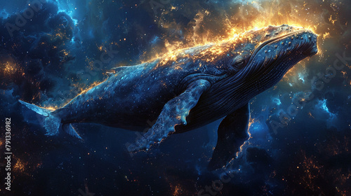 whale, megalodon in sea, glowing illuminate giant fish