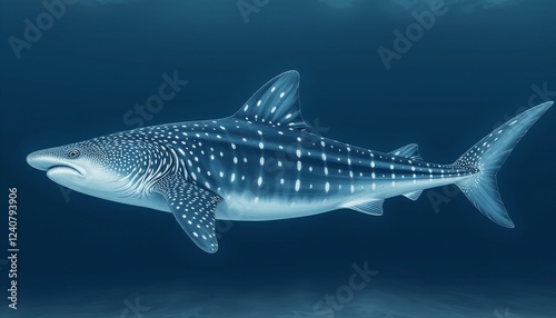 Whale shark swimming gracefully in deep blue ocean water surrounded by marine life and coral reefs. Ideal for nature and wildlife photography.