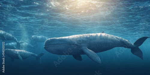 Whales Pod Diving Deep Ocean Sunlight Underwater Marine Life