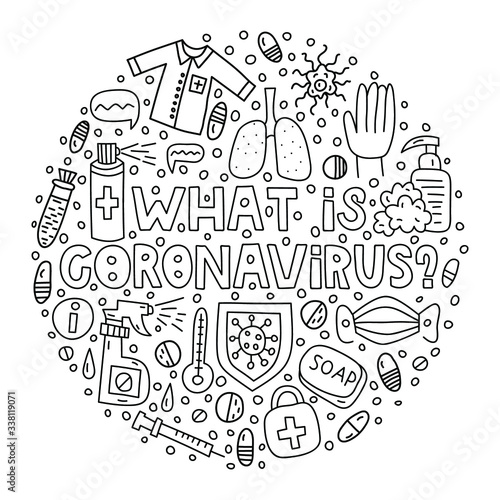 What is Coronavirus? Doodle illustrations with lettering in circle shape