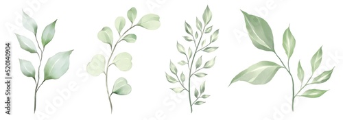 wheat ears Watercolor green leaves collection. Set of lovely watercolor leaves and branches. Botanical illustration.