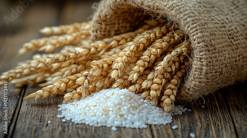 Wheat ears and rice spilling from burlap sack on rustic wooden table.