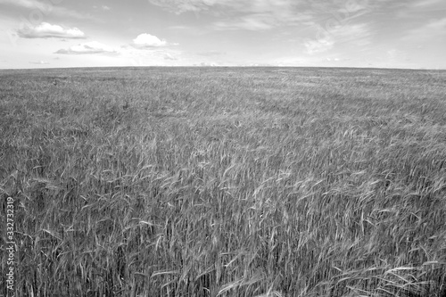 Wheat field and sky in black and white.