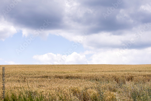 Wheat field and sky. Landscape with field and blue sky. Agricultural crops. View. Nice nature. Field of wheat