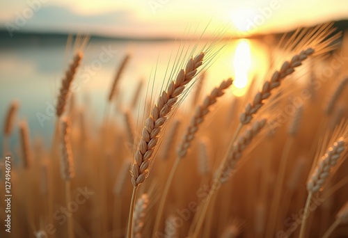 Wheat Field Serenity: Photorealistic Ears of Wheat Reflected on a Lake's Surface in Resinous, Retro Style with Backlighting, Evoking Classic Harvest Time.