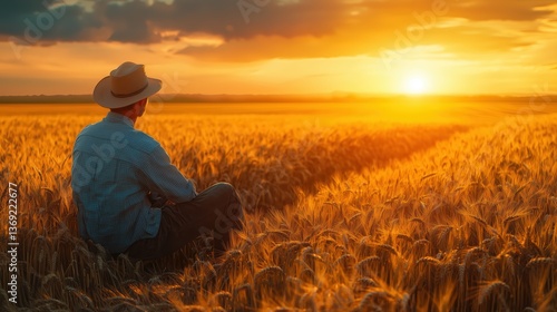 Wheat Field Serenity with Farmer Against Warm Sunset Backdrop