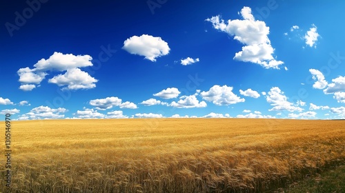 Wheat field under a clear blue sky with fluffy clouds