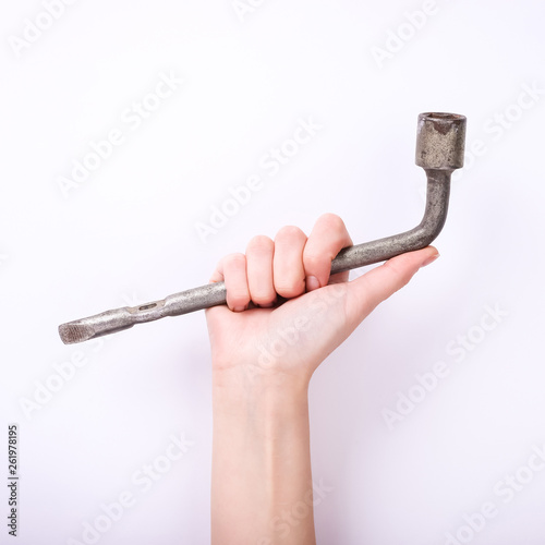Wheel wrench in hand of the girl. Symbol of hard work, feminism and labor day. Isolate on white background.