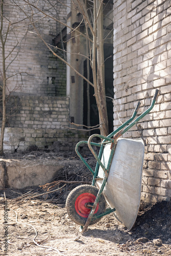 Wheelbarrow with stones, building construction site background. Trolley for garden works. Old house demolition. Cement, concrete mixture and garbage carry. Stylish, scenic backdrop, space for design