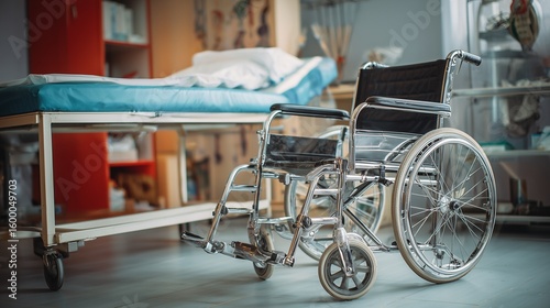 Wheelchair beside medical examination table accessibility and healthcare support