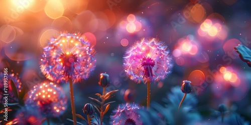 Whimsical 5G towers as giant, iridescent dandelions spreading high-speed connectivity like glowing seeds