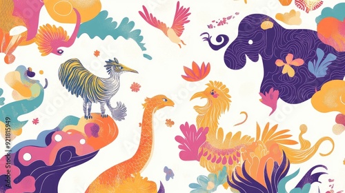 Whimsical abstract pattern with auspicious creatures such as tigers, cranes, and elephants, featuring a playful background and space for text