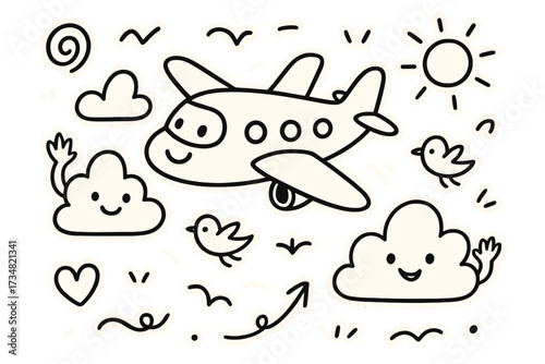 Whimsical Adventure Stickers. Adventure doodle stickers: airplane with a smiling face, fluffy clouds waving, tiny birds,