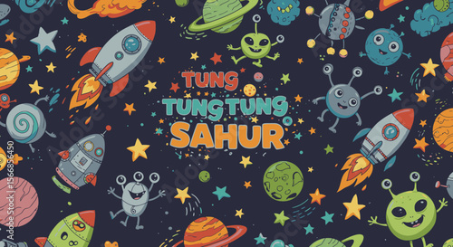 Whimsical and colorful illustration featuring rockets, planets, aliens, and stars, creating a fun and playful outer space theme perfect for children's designs.