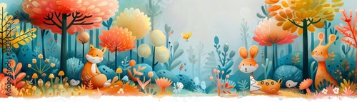 Whimsical and fun cartoon animals amidst a vibrant forest setting, playful and lively.