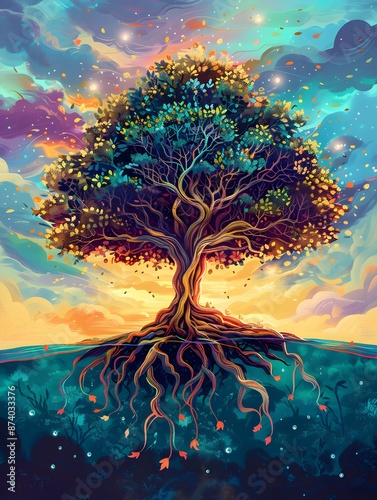 Whimsical artwork of a magical tree with radiant colors, deep roots, and starlit sky. Ideal for fantasy themes and artistic backgrounds.
