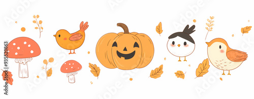 Whimsical Autumn Illustration of a Cheerful Pumpkin with Playful Birds and Mushrooms, Featuring Cozy Fall Leaves and a Warm Color Palette in a Cartoonish Style