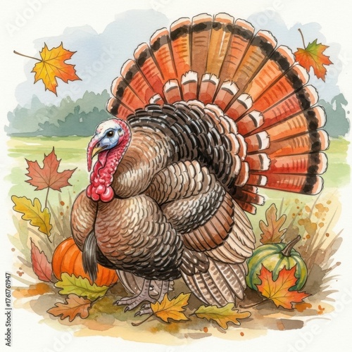 Whimsical autumnal illustration of a turkey amidst vibrant fall foliage