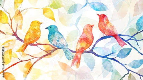 Whimsical birds perched on twisting branches, stained glass watercolor, radiant tones, soft pastel glow, centered on a crisp white background, 8K