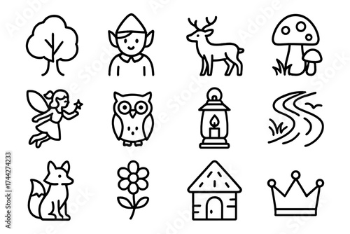Whimsical cartoon forest set with fairy, elf, owl, and woodland icons
