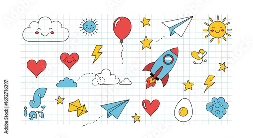 Whimsical Childrens Doodle Collection Featuring Rockets Balloons Hearts Stars and Cute Weather Elements