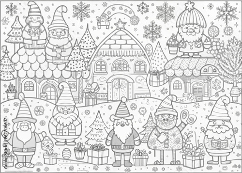 Whimsical Christmas Village with Elves for Coloring Books and Craft Projects