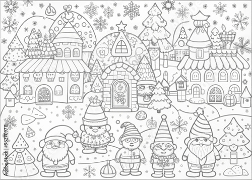 Whimsical Christmas Village with Elves for Coloring Books and Craft Projects