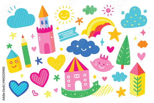 Whimsical collection of hand drawn cartoon elements featuring smiling clouds rainbows and playful shapes