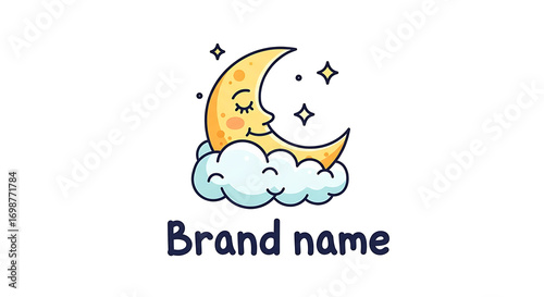 Whimsical crescent moon sleeping peacefully on a fluffy cloud, surrounded by twinkling stars.