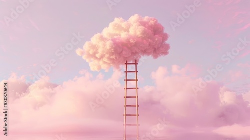 Whimsical Daydream Journey: A Wooden Ladder Leading to a Soft Cloud Against a Pastel Pink Sky