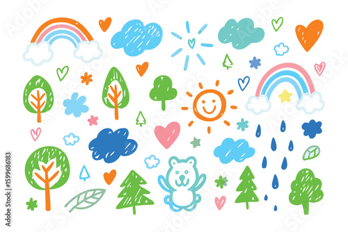 Whimsical Doodle Set: A cheerful collection of hand-drawn elements, including rainbows, clouds, hearts, trees, and a friendly sun, forming a delightful and playful visual narrative.