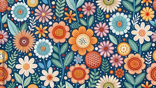 Whimsical Floral Pattern with Retro Style on Dark Blue Background