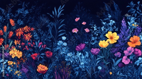 Whimsical floral tapestry in deep indigo hues and vibrant jewel tones