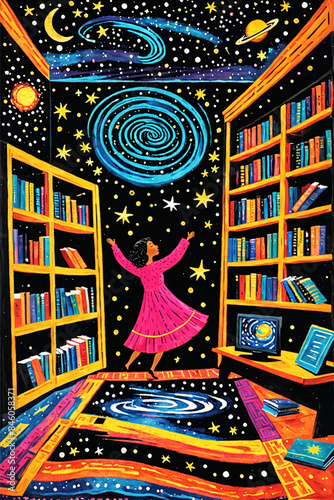 Whimsical folk art girl education, surreal science library space reading literacy