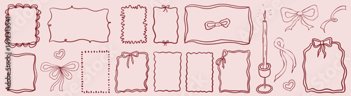 Whimsical frame with bow and curly line. Elegant frame vintage coquette style. Whimsical vintage french outline design.
