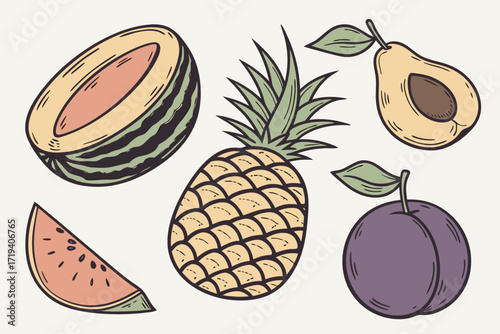 Whimsical Fruit Collection: An eye-catching illustrated assembly, showcasing a pineapple, watermelon, avocado, plum, and pear, each element in an artistic, hand-drawn style.