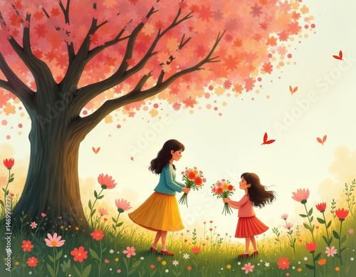 Whimsical Garden Scene with Child Giving Flowers to Mother Under a Tree on Mother’s Day