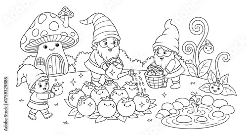 Whimsical Gnome Family Tending a Garden of Enchanted Berries Line Art Coloring Sheet
