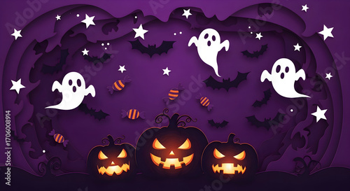 Whimsical Halloween Scene with Pumpkins, Ghosts and Bats Paper Cut Illustration