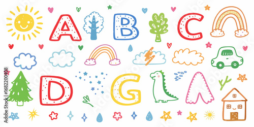 Whimsical hand drawn alphabet letters and cute illustrations for childrens educational content