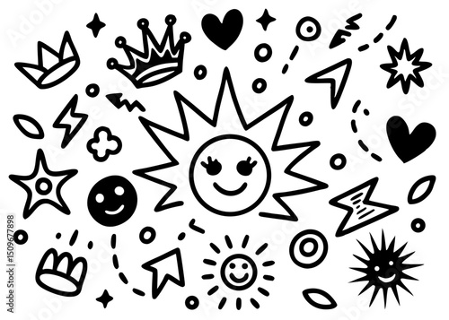 Whimsical hand drawn doodle elements in black and white on transparent background