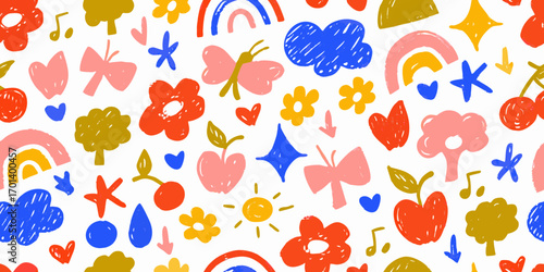 Whimsical hand drawn doodle pattern with rainbows flowers clouds hearts and stars