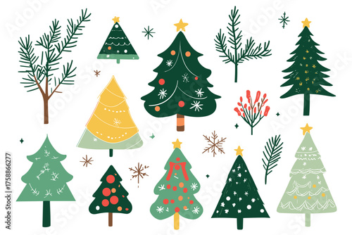 Whimsical hand-drawn christmas trees and pine sprigs festive holiday elements collection illustration