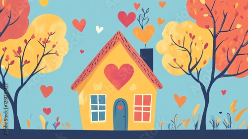 Whimsical House with Bouquet of Hearts Emerging from Chimney