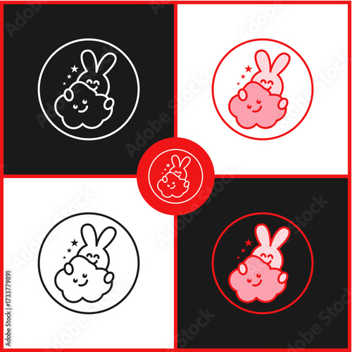 Whimsical illustration of a cute cartoon bunny in a cloud with stars, presented in four distinct color schemes