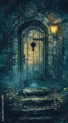 Whimsical Illustration of a Magical Door with Lantern and Nature