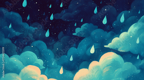 Whimsical illustration of raindrops falling from the sky in children’s book style, playful seamless background for storybooks, wallpapers, posters, and creative design projects