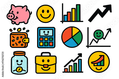 Whimsical Investment Tools silhouette set: cartoon piggy bank, smiling coin, colorful chart, doodle arrow, confetti wallet, playful calculator, rainbow pie chart, cheerful graph