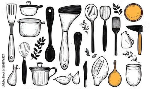 Whimsical Kitchen Utensils Doodle, a playful illustration featuring various kitchen tools in a creative, hand-drawn style, perfect for culinary art.
